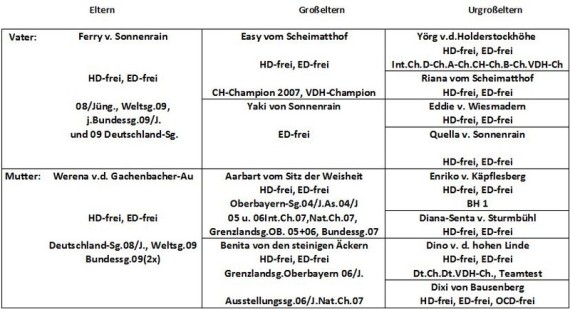 Eine mir ansprechende Hündin, mittelkräftig aufgebaut, typgerechter Kopf, hoch angesetzte Hängeohren, dunkle Augen gut eingesetz, dkl. Nasenpigment, Scherengebiss vollzahnig, VH u. HH korrekt gestellt, gewinkelt und gut bemuskelt, schönes gepflegtes Haarkleid, eine schöne, aber eine etwas kleinere Vertreterin ihrer Rasse